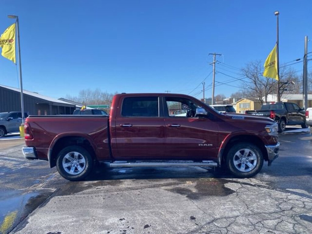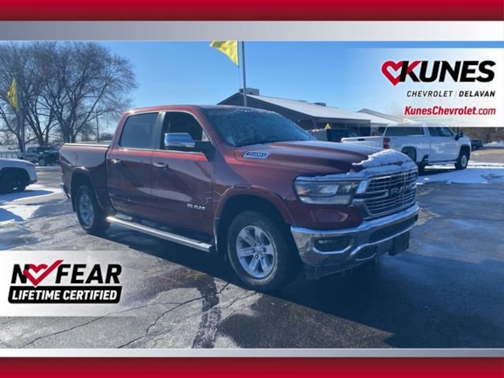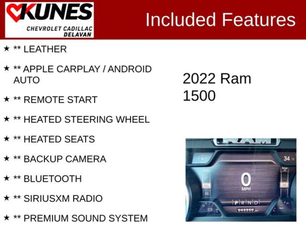 2022 Ram 1500 Laramie Delmonico Red Pearlcoat 4WD HEMI 5.7L V8 Multi Displacement VVTRecent Arrival! Clean CARFAX. CARFAX One Owner. 5.7L V8 engine Laramie Level A Equipment Group: cross-traffic alert, rain-sensing wipers, rear parking sensors, rear collision mitigation Premium sound system Trailer brake control Tow hitch Heated front seats and heated steering wheel Leather-trimmed bucket seats Power driver seat with seat memory Remote engine start and keyless entry Rear defrost and privacy glass Apple CarPlay and Android Auto integration Back-up camera Blind spot monitoring (cross-traffic alert) Rear parking sensors Universal garage door opener Power folding, heated outside mirrors Auto-dimming rearview mirror Satellite radio, AM/FM radio, Bluetooth Fog lamps and LED headlights Adjustable and leather-wrapped steering wheel Aluminum wheels WiFi hotspot Floor mats included